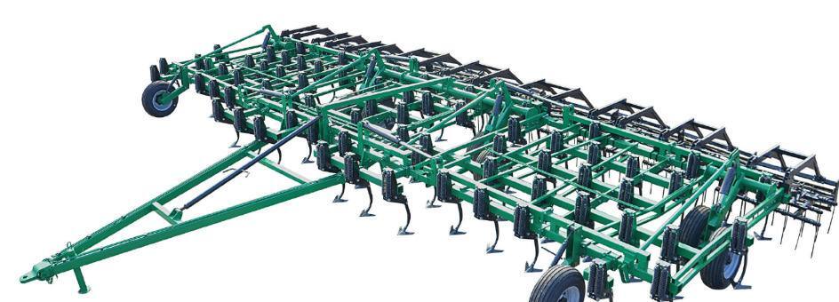 Расстояние между рядами рабочих органов700 мм, что позволяет оптимально распределить механизмы лап и исключить забивание культиваторов растительными остатками. Клиренс(расстояние от нижней плоскости лап до нижней плоскости рамы) 550 мм, что также позволяет стабильно работать во всем диапазоне регулировок глубины обработки. Культиваторы паровые серии КП разработаны для обработки паровых полей для создания высококачественного семенного ложа. Превосходное крошение и выравнивание почвы по длине и ширине поля достигается за счет 5–6 (в зависимости от модели) рядов расположения рабочих органов. Подрезание растительных остатков составляет 100 %, за счет 155 % перекрытия лап.