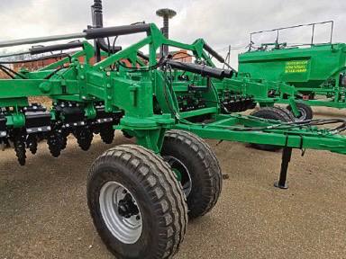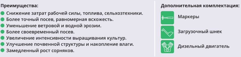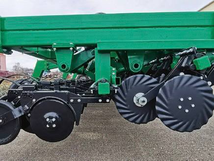 Новые стандарты в агротехнике, устанавливаемые современной ресурсосберегающей техно-логией нулевой обработки почвы (no-till), пред-усматривают отказ от механической обработки почвы в сочетании с внедрением почвозащитных севооборотов, а также подавлением сор-ной растительности и вредителей с помощью агротехнических и химических методов защиты растений. Формируемый на поверхности поля устойчивый мульчирующий слой из растительных остатков, являющийся непременным условием внедрения no-till, обеспечивает защиту почвы от водной и ветровой эрозии, создает оптимальный температурный и водно-воздушный режим, способствует эффективному подавлению роста сорняков и активизации почвенной микро-флоры, является основой для воспроизводства плодородного слоя. Посевные комплексы серии «Владимир» оснащаются универсальными бункерами. Универ-сальный бункер 8 м³, разделенный на две части60/40, под семена и удобрения. Одноосная конструкция бункера догружает задние колеса трак-тора и оказывает меньшее сопротивление при работе. Двухдисковые сошники установлены на раме ПК «Владимир» с междурядьем 17,5 см в шахмат-ном порядке с целью предотвращения их забивания. Сошники обеспечивают точную заделку семян и удобрений на заданную глубину 2-10 см в соответствии с агротехническими требованиями. Эластомерные муфты прекрас, но копируют рельеф почвы, при этом значительно упрощается вся система крепления сошников. Максимальное давление на сошник до 80 кг. Перед каждым сошником расположен колтерный диск, который осуществляет аккуратную разделку почвенного пластаи органических остатков, облегчая тем самым ход сошника и качественное формирование им борозды даже в условиях повышенной влажности почвы и наличия большого количества органики на ее поверхности (в т.ч. стерня кукурузы и подсолнечника). В результате корневая система растений развивается вертикально вниз ей доступна влага и питательные вещества нижних слоев почвы. Сошник вносит семена и удобрения на заданную глубину, укладывает на плотное подготовленное ложе и закрывает борозду, а следующее позади прикатываю-щее колесо уплотняет засеянную полосу. Глубина обработки колтерными дисками регулируется гидроцилиндрами, добавляя/уменьшая количество клипс на штоке.